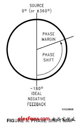 相位偏移就是反馈信号经过整个回路后出现的相位改变(Phase Change)的总和(相对起始点)。相位偏移,单位用度(Degrees)表示,通常使用网络分析仪(network analyzer)测量。理想的负反馈信号与源信号相位差180°(如图8:相位偏移示意图),因此它的起始点在-180°。在图7中可以看到这180°的偏置,也就是波型差半周。
