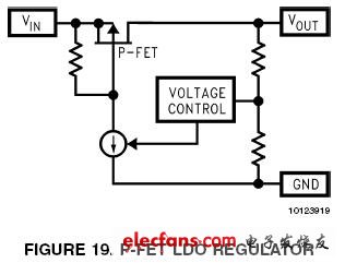 LDO稳压器可以使用P-FET(P沟道场效应管)作为导通管(图19:P沟道场效应管LDO内部结构框图)。为了阐述使用Pl-FET LDO 的好处,在PNP LDO(图2)中要驱动PNP功率管就需要基极电流。基极电流由地脚(ground pin)流出并反馈回反相输入电压端。因此,这些基极驱动电流并未用来驱动负载。它在LDO稳压器中耗损的功耗由下式计算: