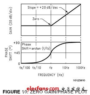 零点(Zero)定义为在增益曲线中斜度为+20dB/十倍频程的点(如图10:波特图中的零点)。零点产生的相移为0到+90°,在曲线上有+45°角的转变。必须清楚零点就是“反极点”(Anti-pole),它在增益和相位上的效果与极点恰恰相反。这也就是为什么要在LDO稳压器的回路中添加零点的原因,零点可以抵消极点。