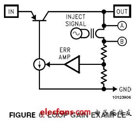 闭环系统(Closed-loop System)有个特性称为回路增益(Loop Gain)。在稳压电路中,回路增益定义为反馈信号(Feedback Signal)通过整个回路后的电压增益(Voltage Gain)。为了更好的解释这个概念,LDO的结构框图(图2)作如下修改(图6:回路增益的测量方法)。