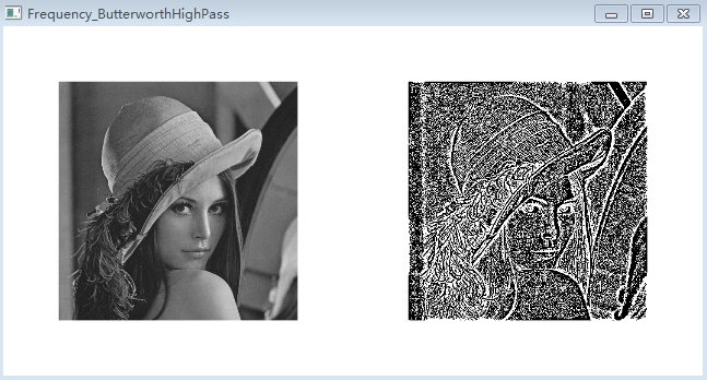 #include <vtkAutoInit.h> VTK_MODULE_INIT(vtkRenderingOpenGL); #include <vtkSmartPointer.h> #include <vtkJPEGReader.h> #include <vtkImageFFT.h> #include <vtkImageButterworthHighPass.h> #include <vtkImageRFFT.h> #include <vtkImageExtractComponents.h> #include <vtkImageCast.h> #include <vtkRenderer.h> #include <vtkImageActor.h> #include <vtkRenderWindow.h> #include <vtkRenderWindowInteractor.h> #include <vtkInteractorStyleImage.h> int main(int argc, char* argv[]) { vtkSmartPointer<vtkJPEGReader> reader = vtkSmartPointer<vtkJPEGReader>::New(); reader->SetFileName("lena.jpg"); reader->Update(); vtkSmartPointer<vtkImageFFT> fftFilter = vtkSmartPointer<vtkImageFFT>::New(); fftFilter->SetInputConnection(reader->GetOutputPort()); fftFilter->Update(); vtkSmartPointer<vtkImageButterworthHighPass> highPassFilter = vtkSmartPointer<vtkImageButterworthHighPass>::New(); highPassFilter->SetInputConnection(fftFilter->GetOutputPort()); highPassFilter->SetXCutOff(0.1); highPassFilter->SetYCutOff(0.1); highPassFilter->Update(); vtkSmartPointer<vtkImageRFFT> rfftFilter = vtkSmartPointer<vtkImageRFFT>::New(); rfftFilter->SetInputConnection(highPassFilter->GetOutputPort()); rfftFilter->Update(); vtkSmartPointer<vtkImageExtractComponents> ifftExtractReal = vtkSmartPointer<vtkImageExtractComponents>::New(); ifftExtractReal->SetInputConnection(rfftFilter->GetOutputPort()); ifftExtractReal->SetComponents(0); vtkSmartPointer<vtkImageCast> castFilter = vtkSmartPointer<vtkImageCast>::New(); castFilter->SetInputConnection(ifftExtractReal->GetOutputPort()); castFilter->SetOutputScalarTypeToUnsignedChar(); castFilter->Update(); vtkSmartPointer<vtkImageActor> originalActor = vtkSmartPointer<vtkImageActor>::New(); originalActor->SetInputData(reader->GetOutput()); vtkSmartPointer<vtkImageActor> erodedActor = vtkSmartPointer<vtkImageActor>::New(); erodedActor->SetInputData(castFilter->GetOutput()); // double leftViewport[4] = { 0.0, 0.0, 0.5, 1.0 }; double rightViewport[4] = { 0.5, 0.0, 1.0, 1.0 }; vtkSmartPointer<vtkRenderer> leftRenderer = vtkSmartPointer<vtkRenderer>::New(); leftRenderer->AddActor(originalActor); leftRenderer->ResetCamera(); leftRenderer->SetViewport(leftViewport); leftRenderer->SetBackground(1.0, 1.0, 1.0); vtkSmartPointer<vtkRenderer> rightRenderer = vtkSmartPointer<vtkRenderer>::New(); rightRenderer->AddActor(erodedActor); rightRenderer->SetViewport(rightViewport); rightRenderer->SetBackground(1.0, 1.0, 1.0); rightRenderer->ResetCamera(); vtkSmartPointer<vtkRenderWindow> rw = vtkSmartPointer<vtkRenderWindow>::New(); rw->AddRenderer(leftRenderer); rw->AddRenderer(rightRenderer); rw->SetSize(640, 320); rw->Render(); rw->SetWindowName("Frequency_ButterworthHighPass"); / vtkSmartPointer<vtkRenderWindowInteractor> rwi = vtkSmartPointer<vtkRenderWindowInteractor>::New(); vtkSmartPointer<vtkInteractorStyleImage> style = vtkSmartPointer<vtkInteractorStyleImage>::New(); rwi->SetInteractorStyle(style); rwi->SetRenderWindow(rw); rwi->Start(); return 0; }vtkImageButterworthHighPass与理想高通滤波使用方法一致。需要设置X和Y轴的截止频率,为了便于比较,其截止频域与理想高通滤波设置一致。