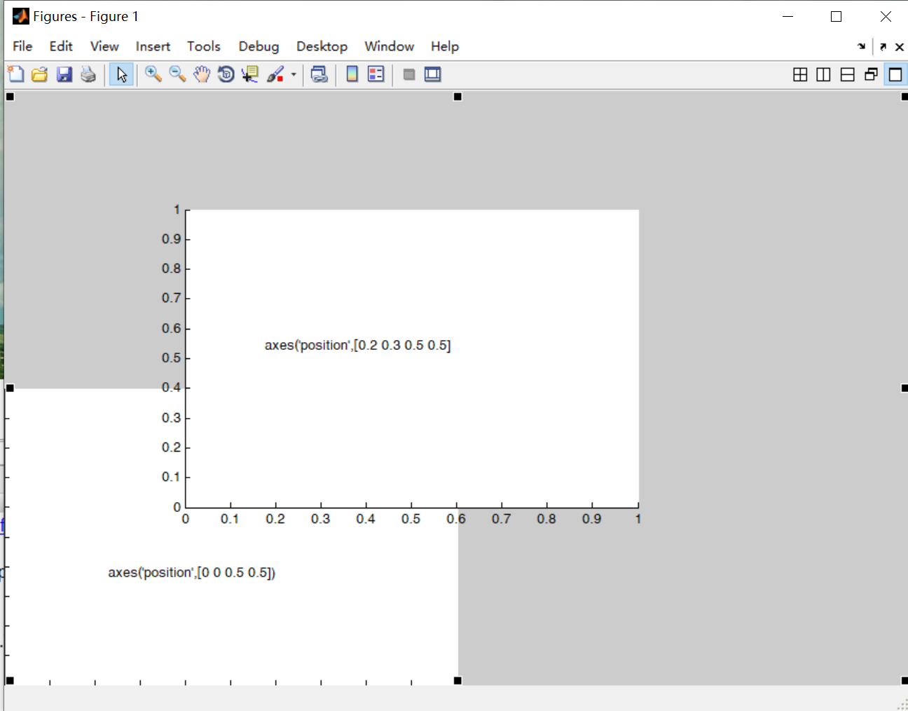 示例:axes('position',[0 0 0.5 0.5])和axes(‘position’,[0.2 0.3 0.5 0.5]),执行结果分别如下图所示: