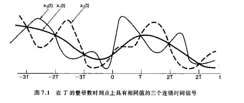 很明显,有无限多个信号都可以产生一组给定的样本值。然而,将会看到,如果一个信号是带限的(即它的傅里叶变换在某一有限频带范围以外均为零),并且它的样本取得足够密的话(相对于信号中的最高频率而言),那么这些样本就能唯一地用来表征这一信号,并且能从这些样本中把信号完全恢复出来。