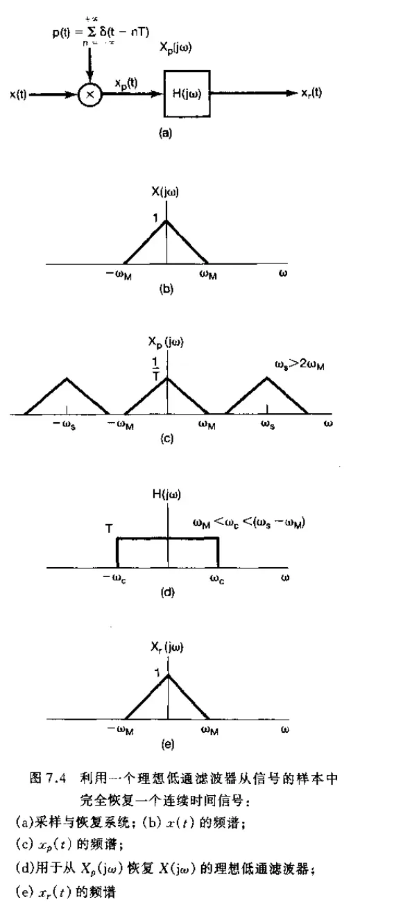 已知这些样本值,我们能用如下办法重建 x ( t ) x(t) x(t):产生一个周期冲激串,其冲激幅度就是这些依次而来的样本值,然后将该冲激串通过一个增益为 T T T,截至频率大于 ω M omega_M ωM,而小于 ( ω s − ω M ) (omega_s-omega_M) (ωs−ωM)的理想低通滤波器,该滤波器的输出就是 x ( t ) x(t) x(t)。