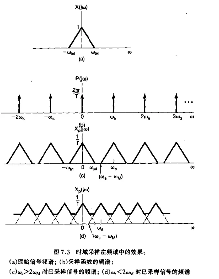 当 $ omega_M < omega_s- omega_M $ 或者 $ omega_s > 2omega_M $ 时,互相移位的这些 X ( j ω ) X(jomega) X(jω) 之间,并无重叠现象出现;反之,则会出现重叠现象。