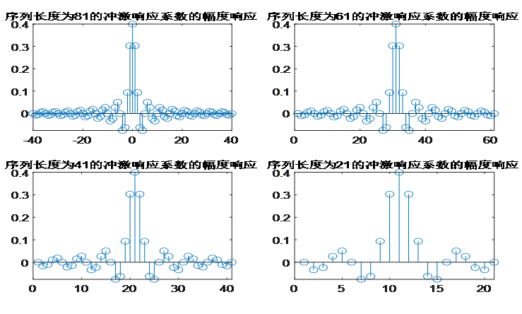 例3:观察吉布斯效应:使用函数sinc,以产生截止频率在ωc=0.4π处、长度分别为81,61,41和21的四个低通滤波器的冲激响应系数,然后计算并画出它们的幅度响应。可使用冒号“:”运算符从长度为81的滤波器的冲激响应系数中抽出较短长度滤波器的冲激响应系数。