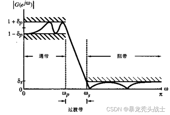 右图是另一种典型的幅度响应指标。在由 0 ≤ ω ≤ ωp 定义的通带中, 幅度值在 1+δp 和 1-δp 间,即幅度以误差 ±δp 逼近1。由 ωs ≤ |ω| ≤ π 定义的阻带中,幅度以误差 δs 接近于0。 δp 和 δs 称为波纹。