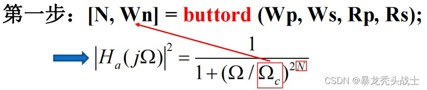 其中输入参数N和Wn可使用函数buttord确定, 输出是向量num和den,它们分别是以