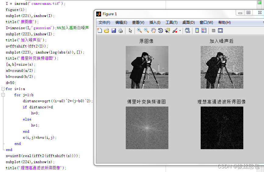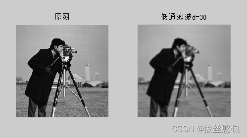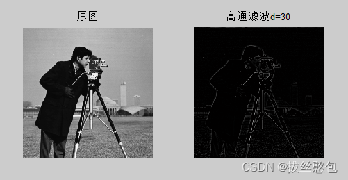 subplot(1,2,2);imshow(I_lpf);title(‘高通滤波d=30’);