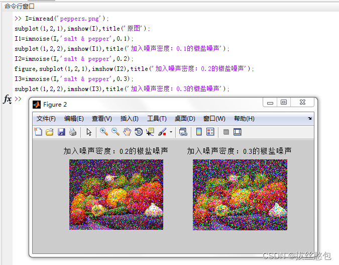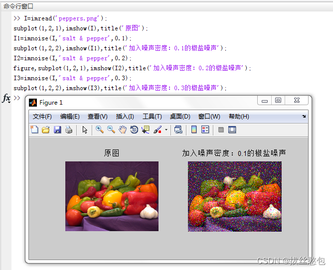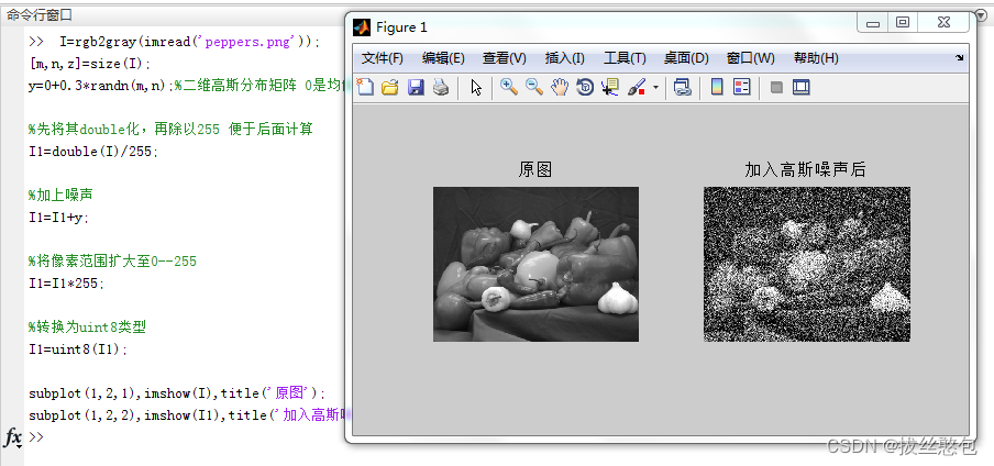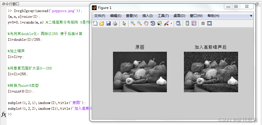- 读取peppers图像,加入标准差为0.1的高斯噪声