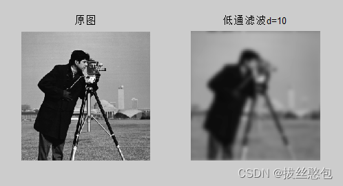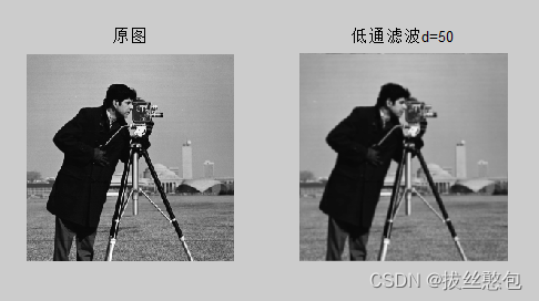 subplot(1,2,2);imshow(I_lpf);title(‘低通滤波d=50’);