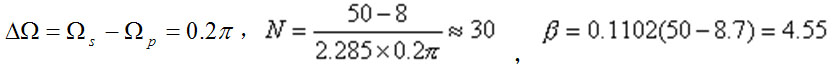 例1 用凯塞窗设计一FIR低通滤波器,通带边界频率Ωp=0.3pi,阻带边界频率 Ωs=0.5pi,阻带衰减δs不小于50dB。