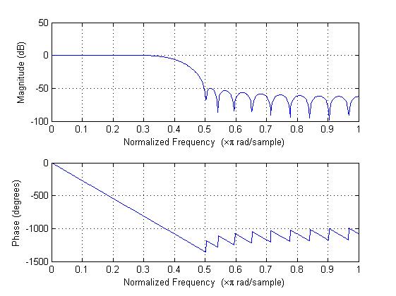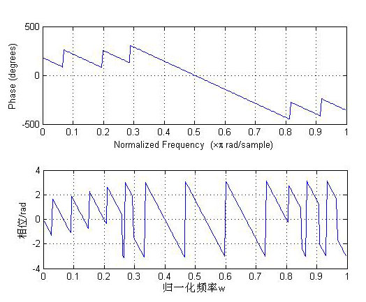 上面第一个图是用角度为单位画出来的,下面的图是用rad单位画出来的。从图形可以观察到在0.3到0.8数字频率间两个图都是严格的线性相位,至于下面的图为什么在这个区间会有跳变是因为rad的区间只有-pi——pi,当相位由-pi继续增加时只能跳到pi而不能大于pi,而角度表示则可以连续增大。