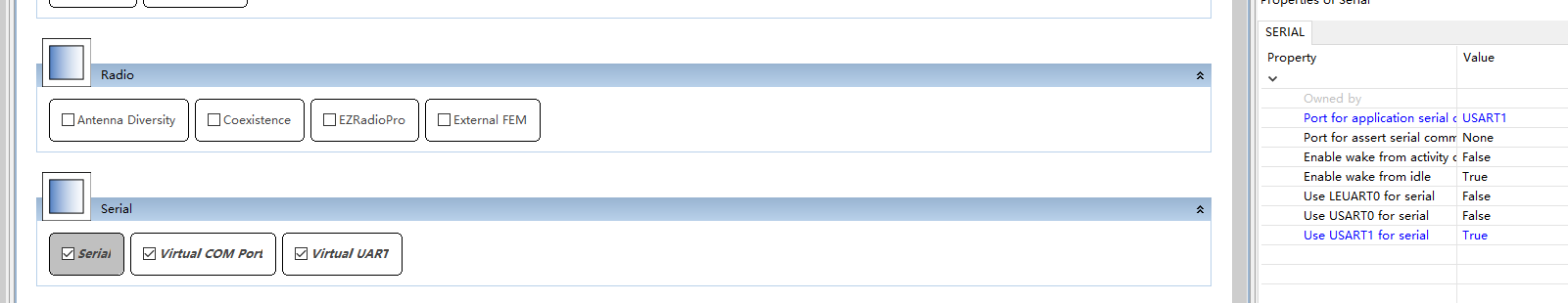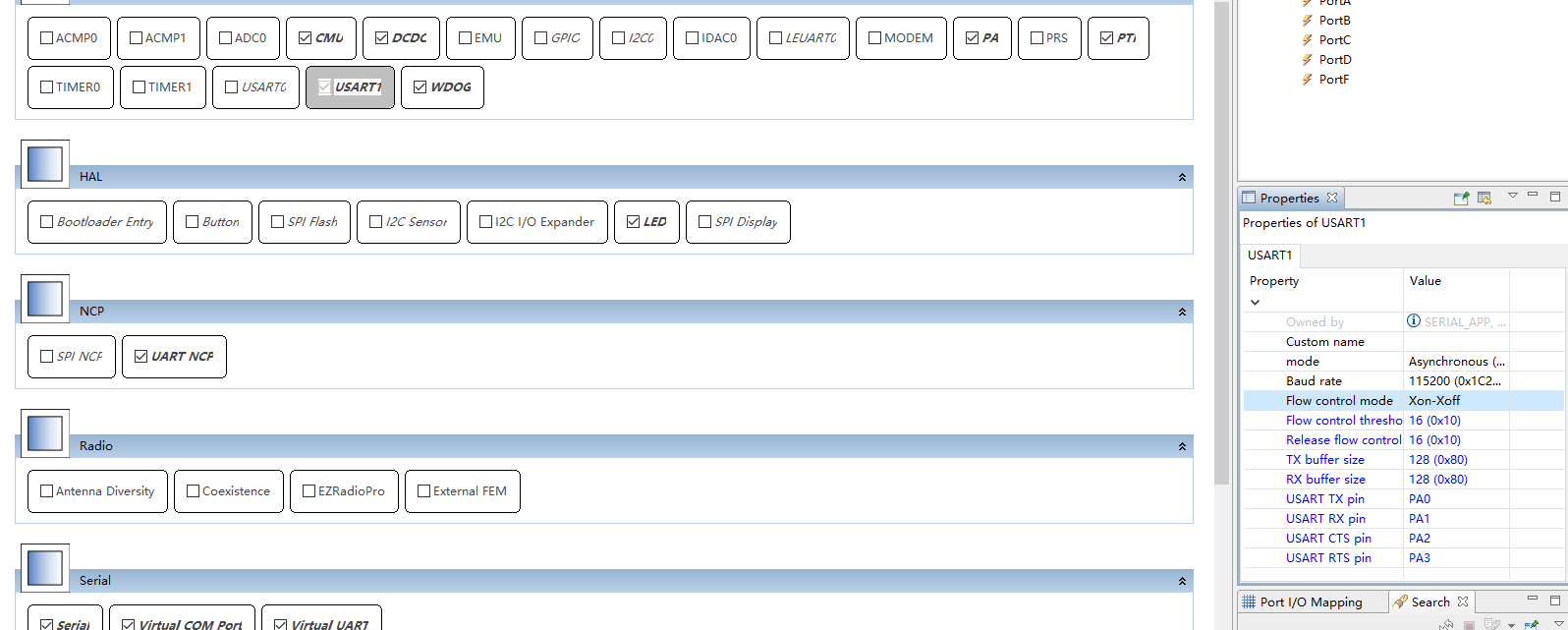 2.打开hwconf文件,更改usart0 的流控模式为软件流控(Xon-Xoff),然后生成编译,可执行文件命令为EFR32MG1P233F256GM48_bootloader-uart-xmodem-combined.s37
