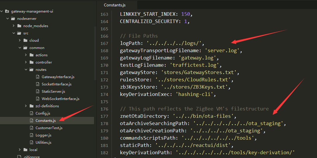 3.nodeserversrccommonConstants.js配置了日志目录、ota文件存放目录、外部程序目录(包括installcode生成key的外部程序路径),如下图所示