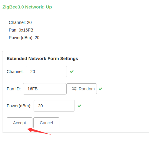 设置好网络参数(通道、PANID),accept后,可以看到新的网络生效。(界面显示先停止已有网络,然后新的网络生效)