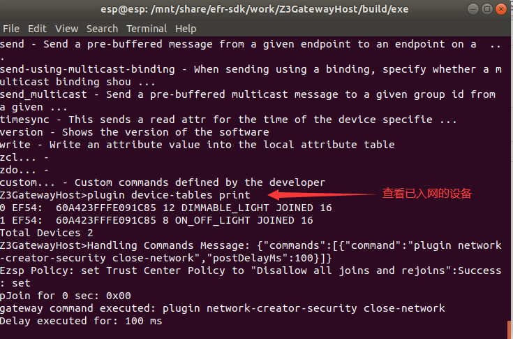 在Z3GatewayHost 的命令行下,通过plugin device-tables print命令可以看到已经加入的设备