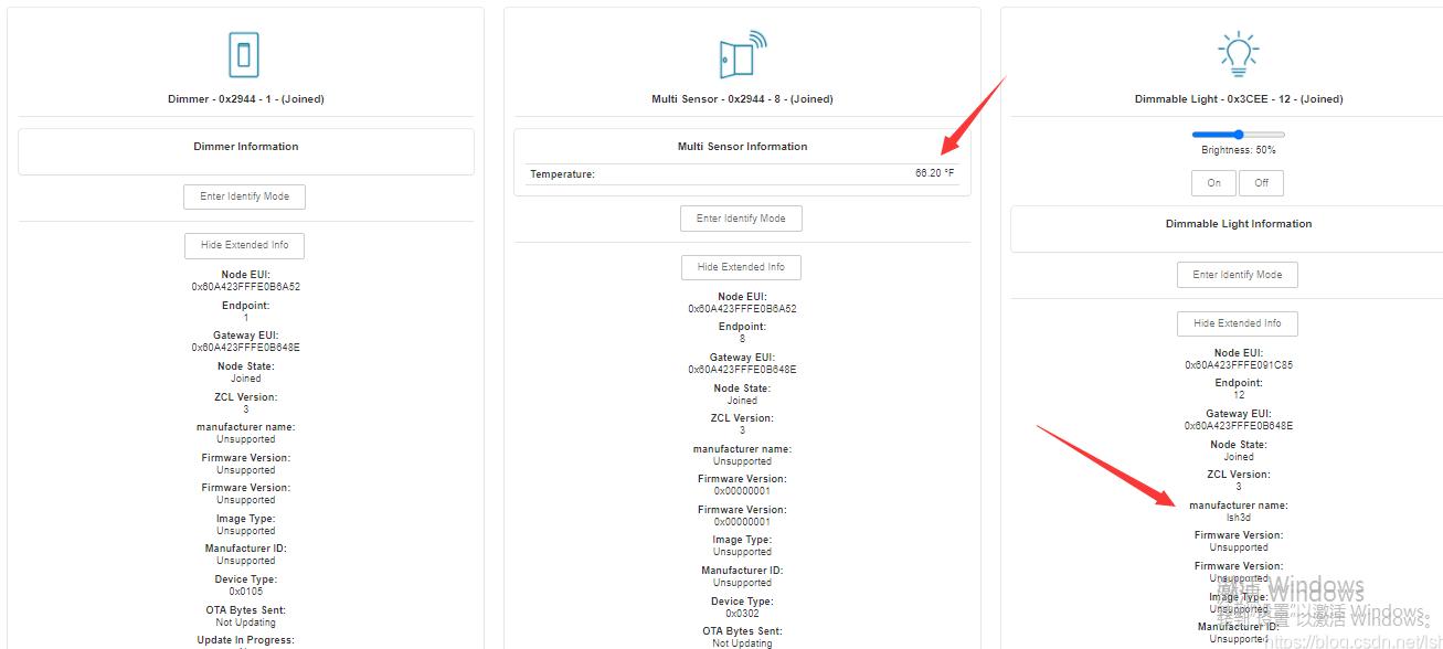 在gateway-management-ui中可以在“Home”标签页下面,看到相关设备的属性,例如下图所示的温度传感器显示的温度,终端的manufacturer name,这些属性都是通过标准的zcl方式进行读取。