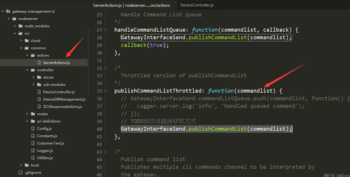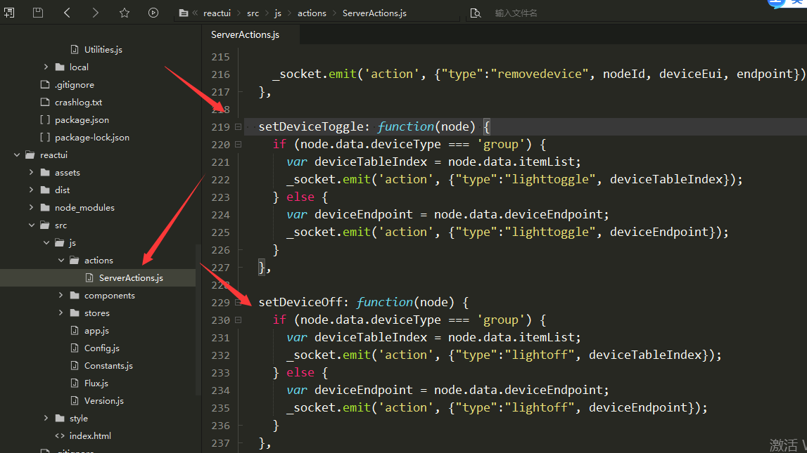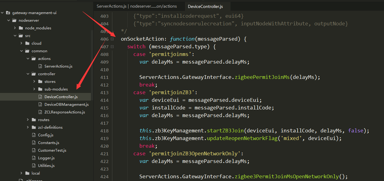 2)nodeserver:reactUI发送的socket请求,会在gateway-management-uinodeserversrccommoncontrollerDeviceController.js中的onSocketAction方法j进行处理。