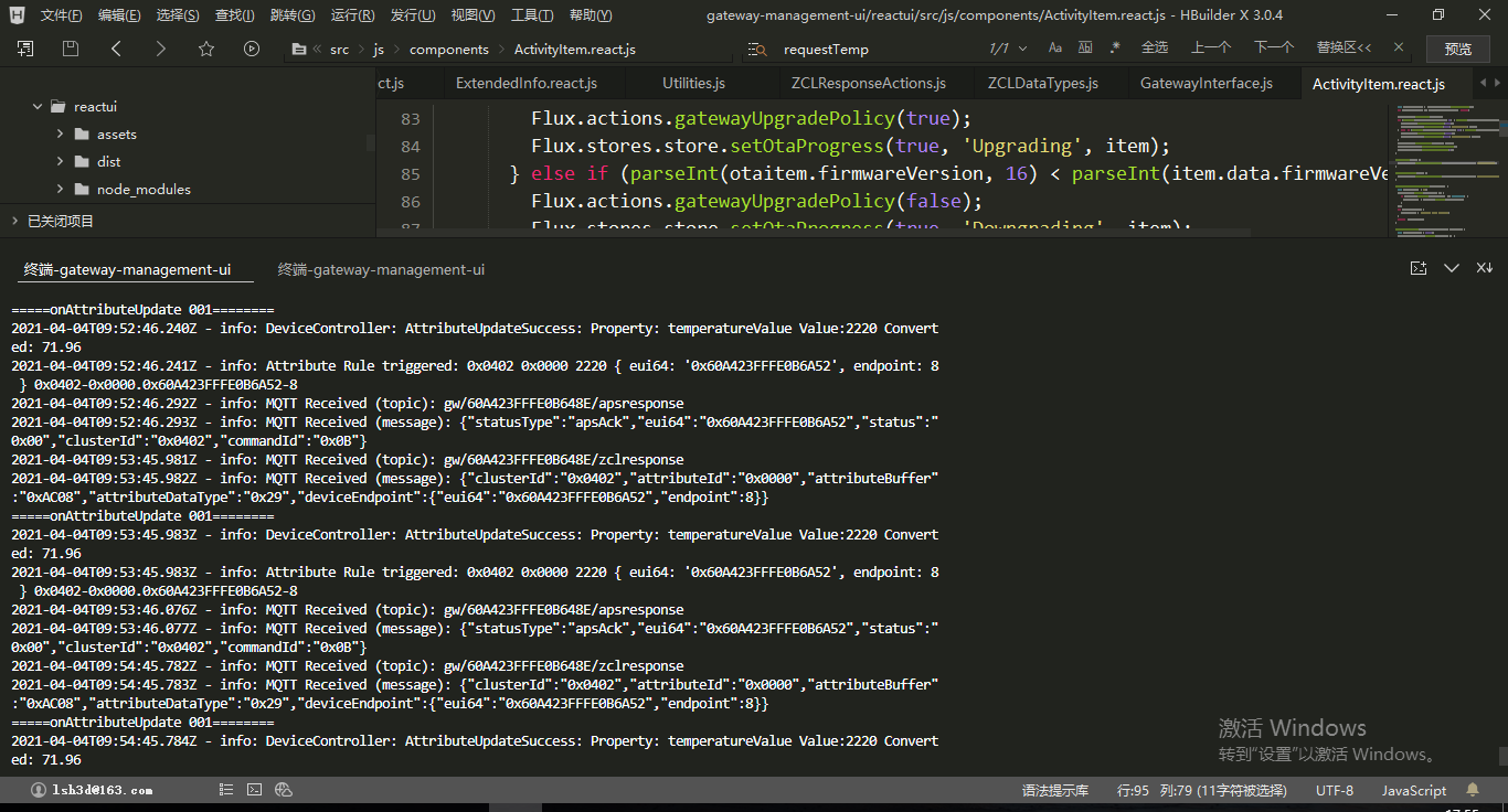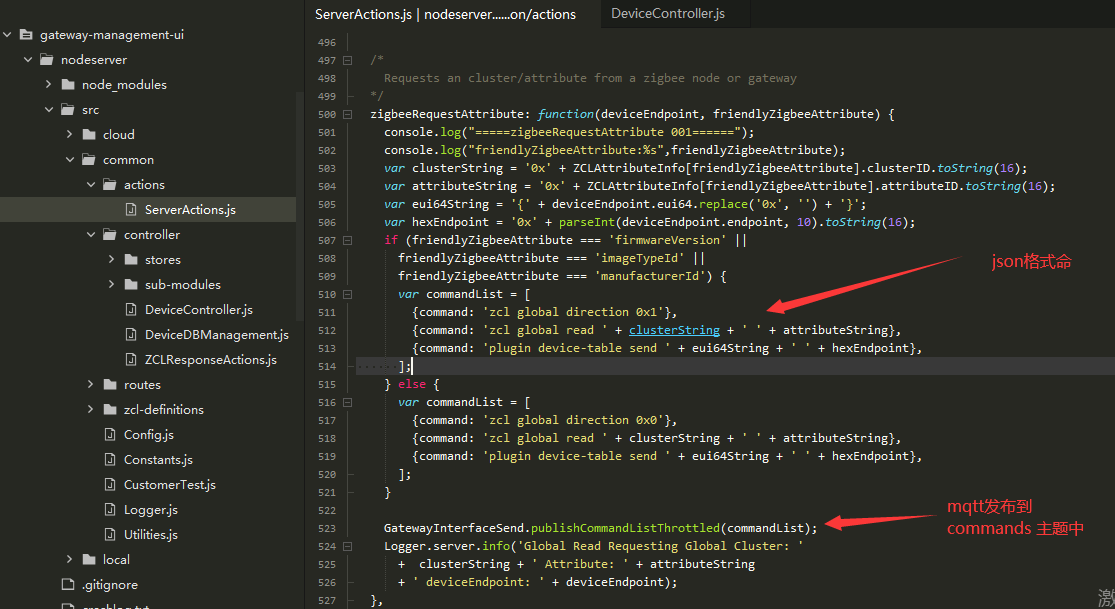 zigbeeRequestAttribute方法位于gateway-management-uinodeserversrccommonactionsServerActions.js中,打开可以看到,它的实现是将命令和参数转换为json格式,然后通过mqtt发布到对应的topic上。
