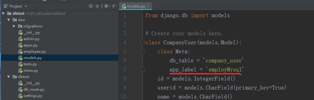 if model._meta.app_label == 'employMysql': # app name(如果该app不存在,则无法同步成功)
