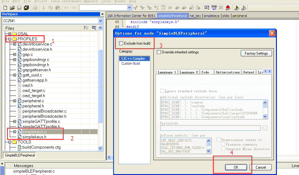 1)在编译环境右边的Workspace中选择PROFILES文件,下拉列表选择选择simplekeys.c(simplekeys.h同理).