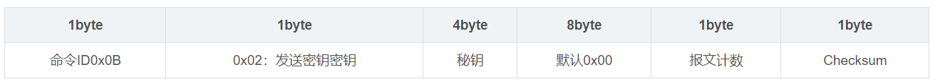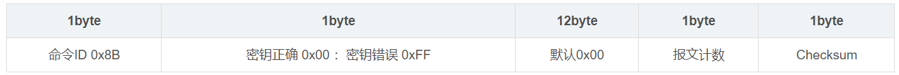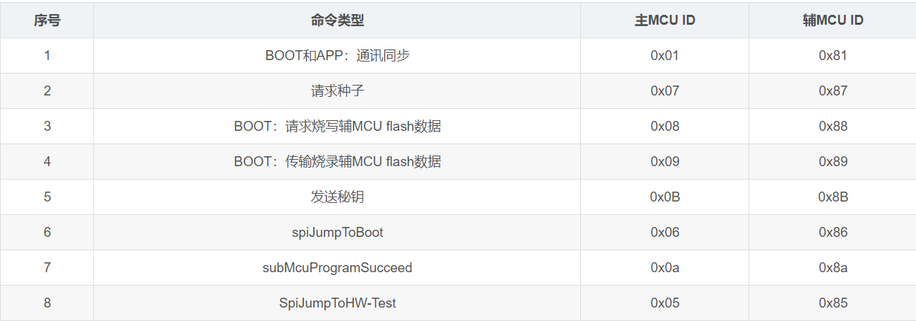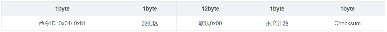 备注:命令ID为主MCU ID或辅MCU ID,出现错误时第二个字节统一是0x00,正确时为0x01。报文计数为0x00~0xFF的循环计数