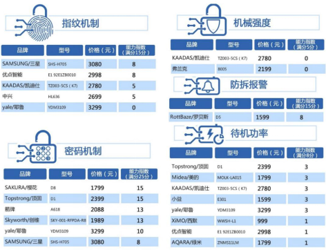 据了解,2016年原国家质检总局对浙江、江苏、河南等省份的智能门锁进行抽查,发现15批产品不达标,不合格产品发现率达到16.67%;今年7月, 省质监局对生产量占全国65%的智能门锁制造大省——广东的智能门锁进行相关风险监测,结果显示约1/10测试产品有问题,其中“能轻易打开的锁具主要是三无产品”。此外,业内主流产品也开始丧失原则,成为问题产品,品牌商沦为“小商贩”,今年5月,南都鉴定评测实验室委托威凯检测技术有限公司对市场上20个主流智能门锁品牌产品进行测试,部分测试结果如下: