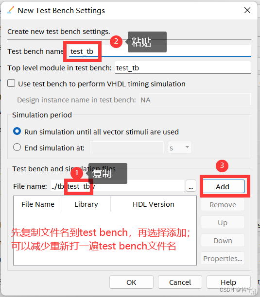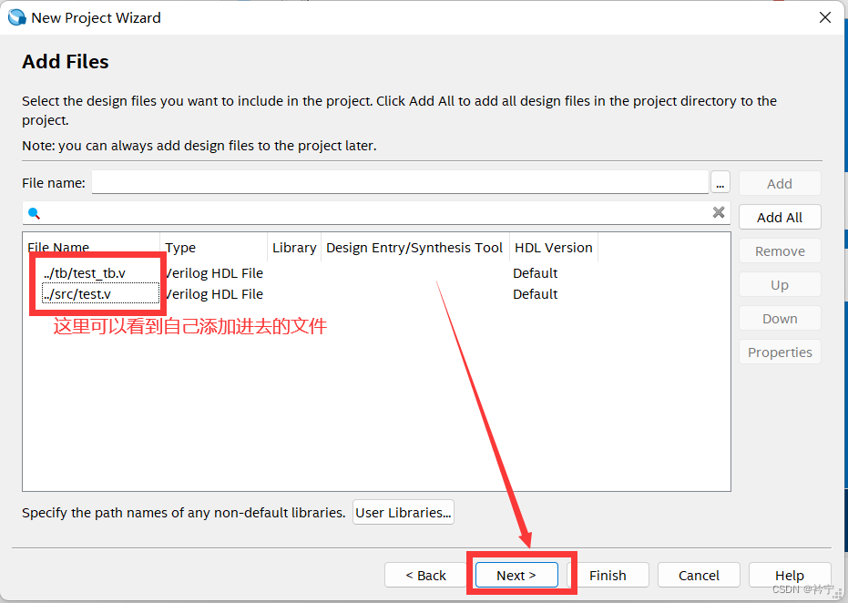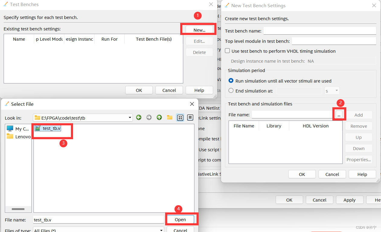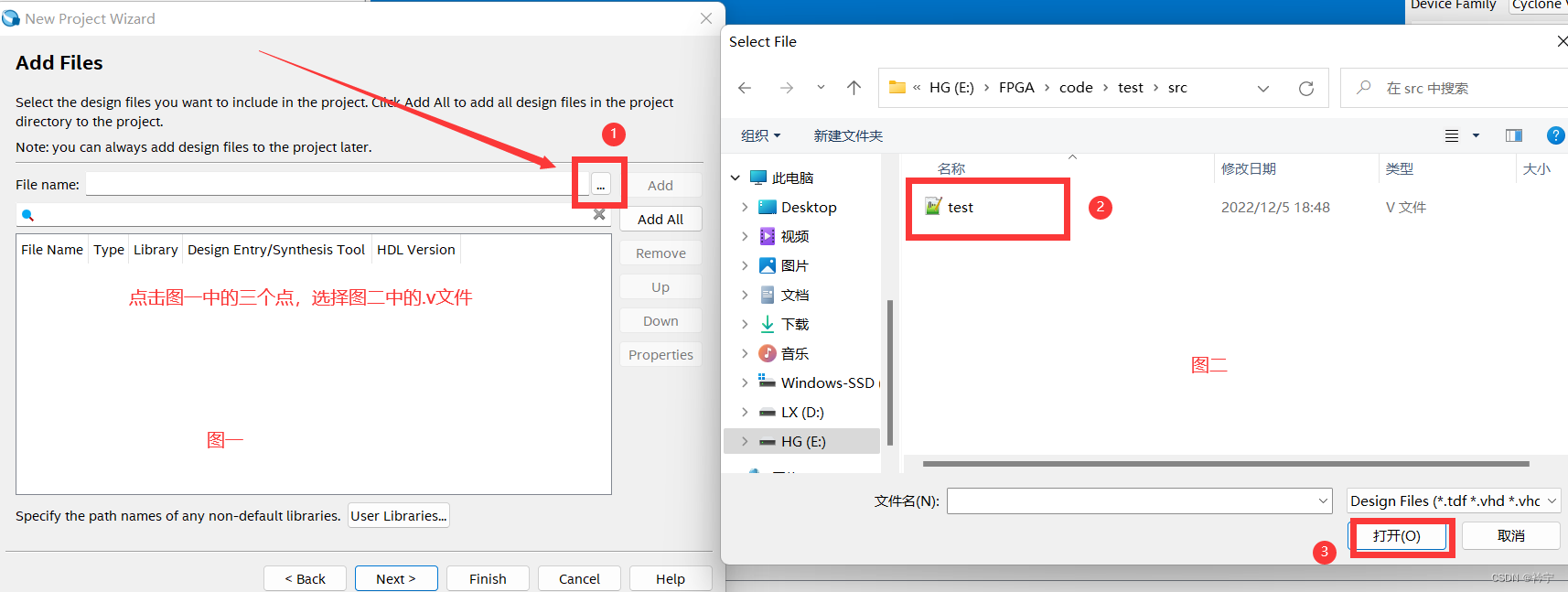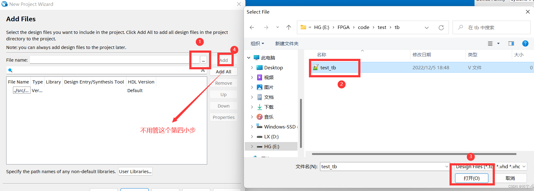 (6)进入如下界面后,选择之前新建的src文件夹中的test.v文件和在tb文件夹下的test_tb.v文件,并将它们打开