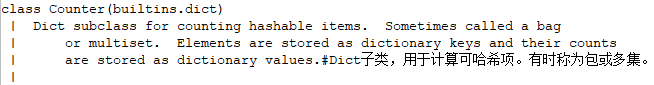 Dict子类,用于计算可哈希项。有时称为包或多集。元素存储为字典键,它们的计数存储为字典值。
