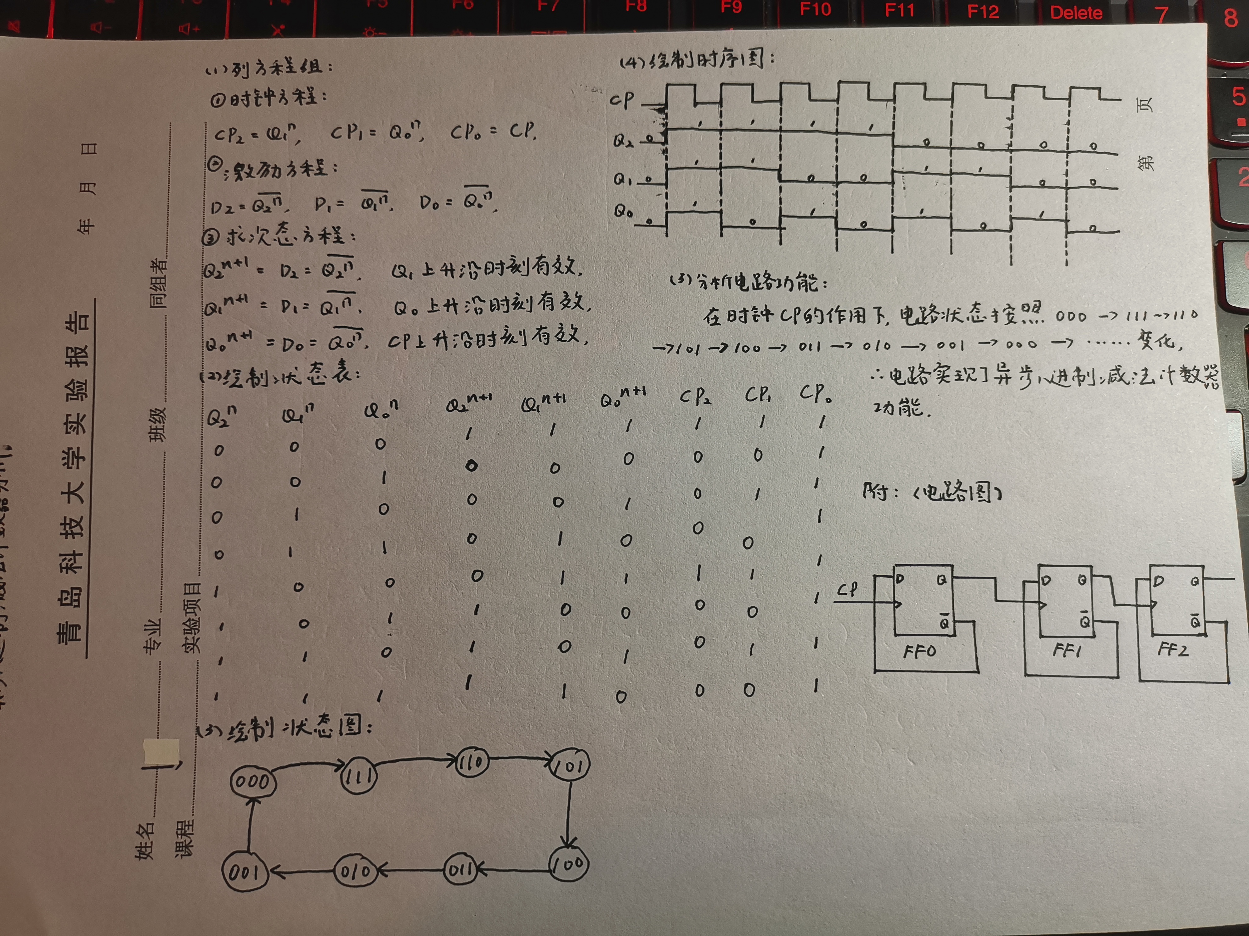 = 1时, 表示时钟有效; 否则时钟无效. 由于0#触发器的时钟信号引脚直接接到系统的时钟信号线上, 故0#触发器和系统时钟CP保持一致: 这是求次态的突破口. 这样一来, 系统