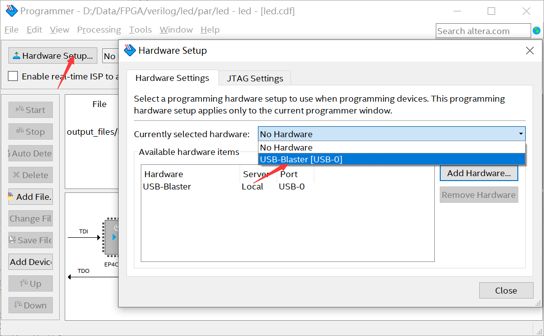 在JTAG链配置窗口中点击【 Setup】找到USB-Blaster[USB-0]。