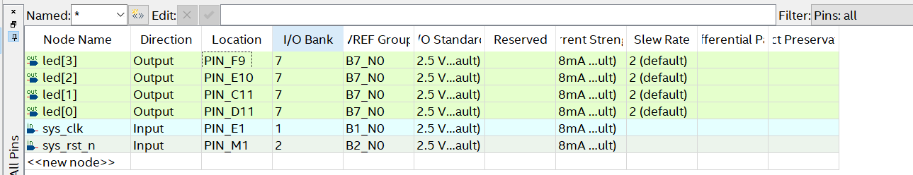 可以看到该界面出现了6个端口分别是4个LED、时钟和复位,可以参考原理图来对引脚进行分配
