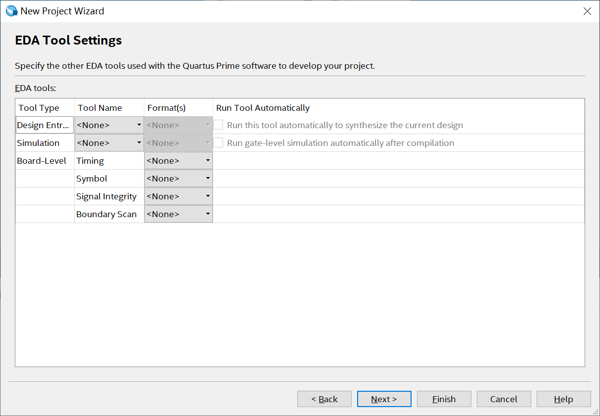 在“ EDA Tool Settings”页面中,可以设置工程各个开发环节中需要用到的第三方EDA工具,比如:仿真工具Modelsim、综合工具Synplify。这里并没有使用任何的EDA工具,所以此页面保持默认不添加第三方EDA工具,直接单击【 Next>】