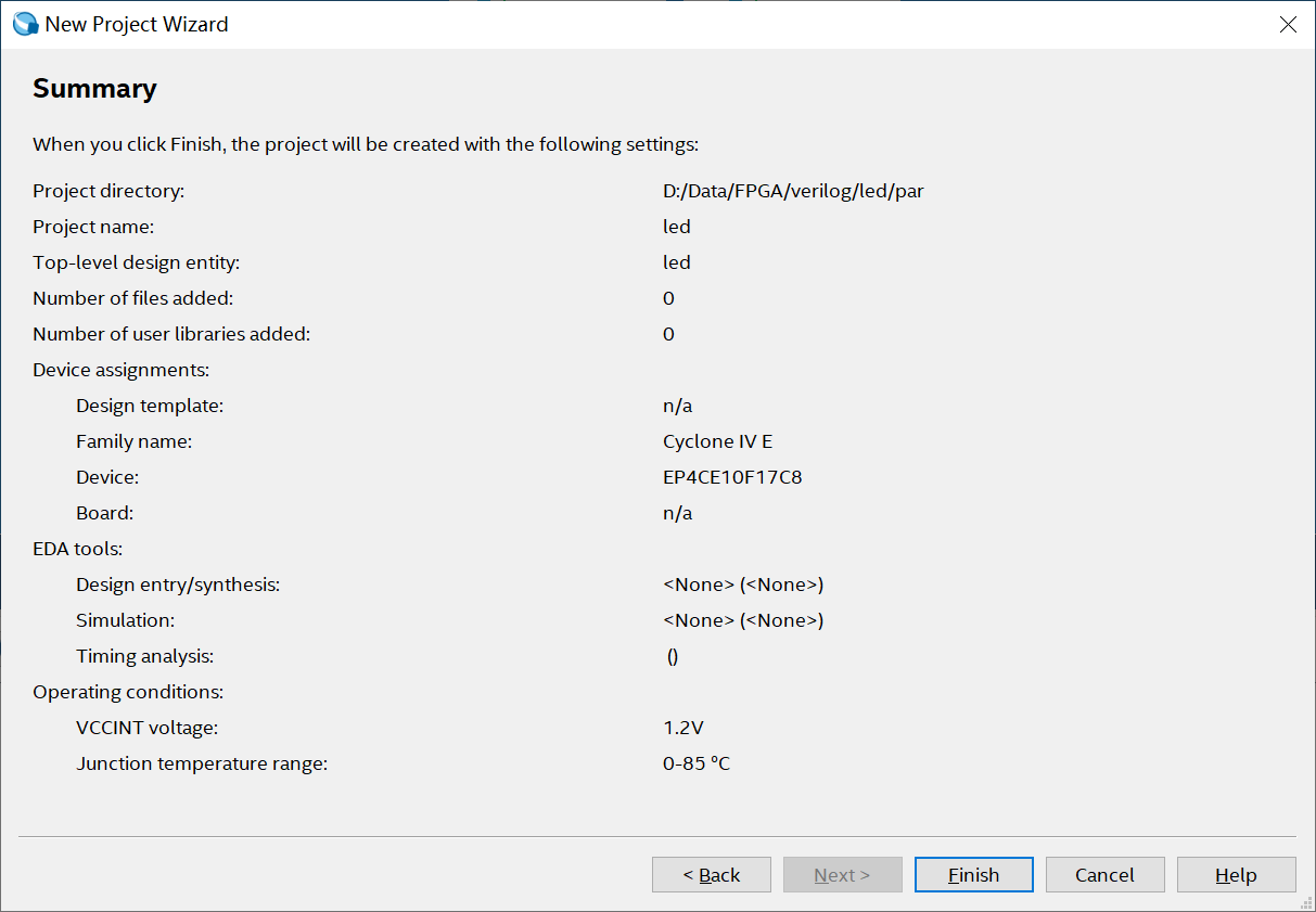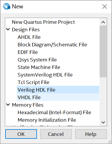 由于使用Verilog HDL语言来作为工程的输入设计文件,所以在Design Files一栏中选择Verilog HDL File