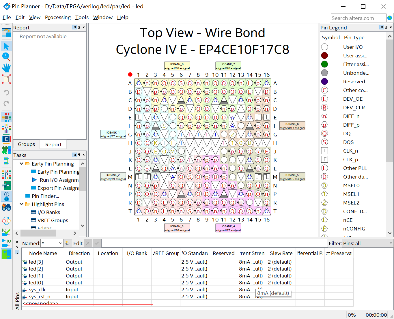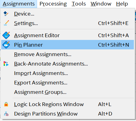 编译通过以后,接下来我们就需要对工程中输入、输出端口进行管脚分配。可以在菜单栏中点击【 Assignments】→【 Pin Planner】或者在工具栏中点击【 Pin Planner】的图标。
