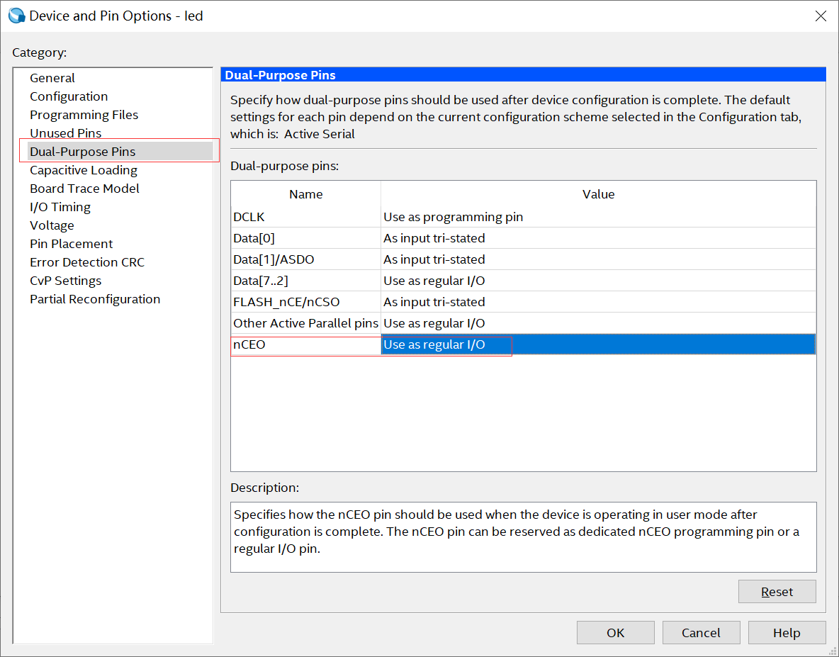 该页面就是可以重新选择器件页面,然后点击【 Device and Pin Options】 按钮, 会弹出一个设置页面,在左侧Category一栏中选择Dual-Purpose Pin。对于需要使用EPCS器件的引脚时,需要将下图页面中所有的引脚都改成Use as regular IO,如果大家不确定工程中是否用到EPCS器件时,可以全部修改。