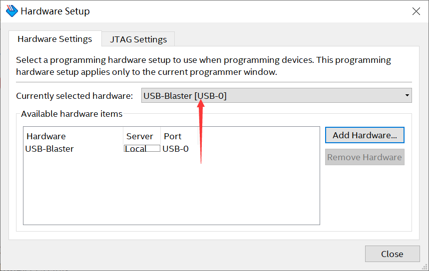 点击上图页面中的【 Hardware Setup...】按钮,选择“ USB-Blaster”