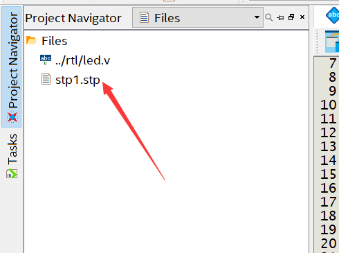 返回到Quartus软件界面, 在工程文件导航窗口可以看到File一栏多了一个stp1.stp文件,这个文件就是刚才添加至工程中的分析文件。