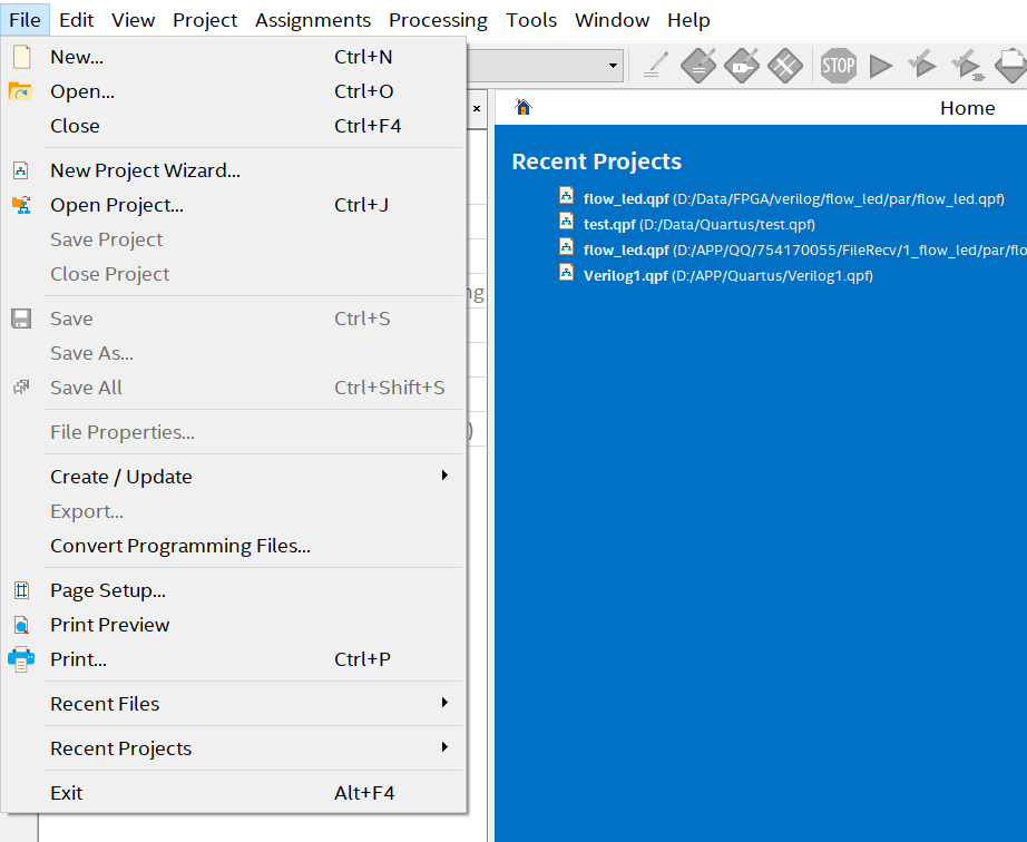 打开Quartus ii 软件,在菜单栏上选择【 File】→【 New Project Wizard…】来新建一个工程,