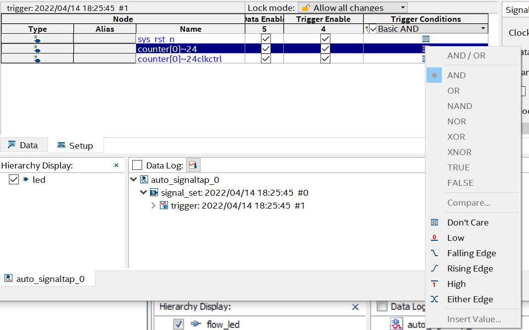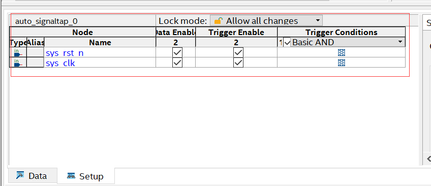 SignalTap软件支持通过设置触发方式来采集波形, 在SignalTap信号列表Setup一栏中,