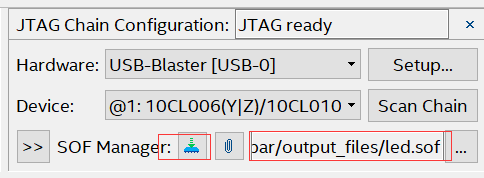 SignalTap软件也是可以给开发板下载程序的,同样也是在JTAG链配置页面的SOF Manager一栏中,点击【 ...】 按钮,选择工程所在路径output_files文件夹下的led.sof,选中后点击Open按钮。