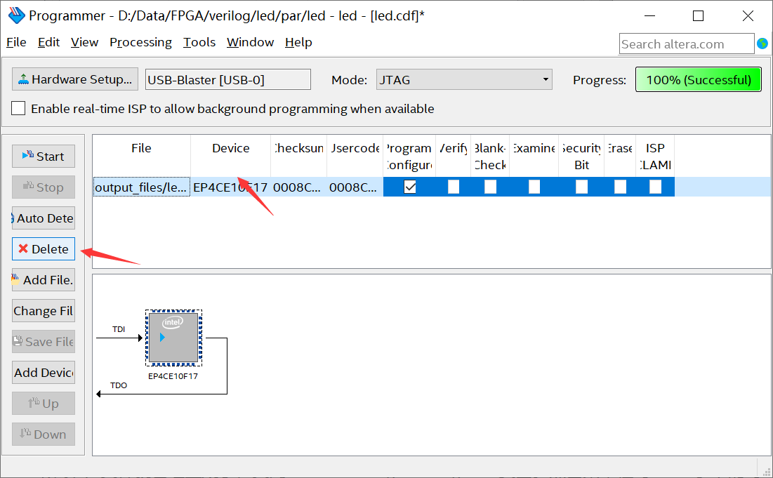 所以 .jic文件就已经生成了,关闭“ Convert Programming File”页面。点击菜单栏【 Tools】下的【 Programmer】(如果下载界面关闭了的话),选中.sof文件, 点击左侧按钮【 Delete】 删去之前添加的sof文件。