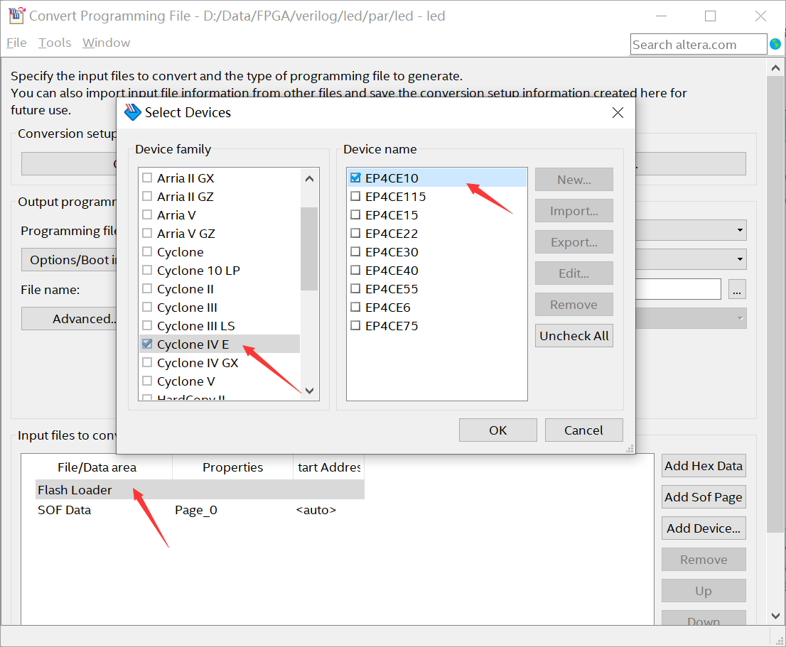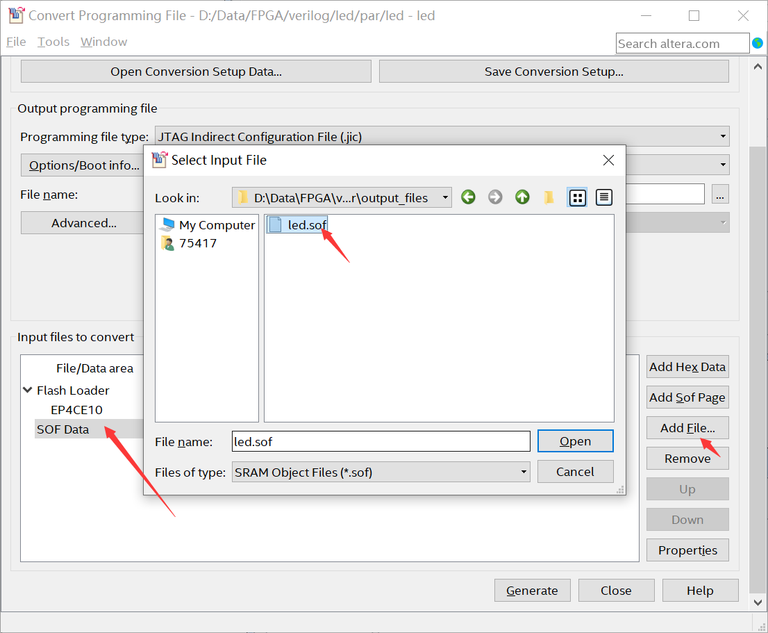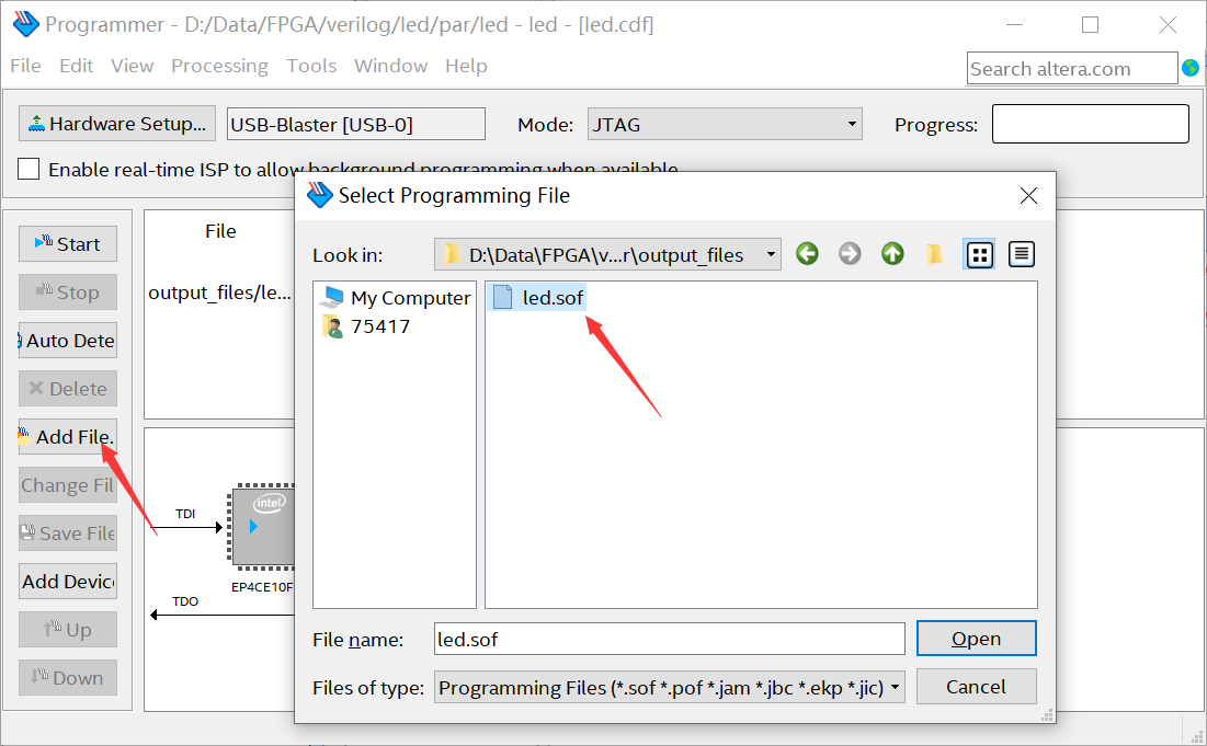 然后选中“ SOF Data”,点击右边的按钮【 Add file….】,找到“ output_files”下面的“ flow_led.sof”文件点击【 Open】即可。