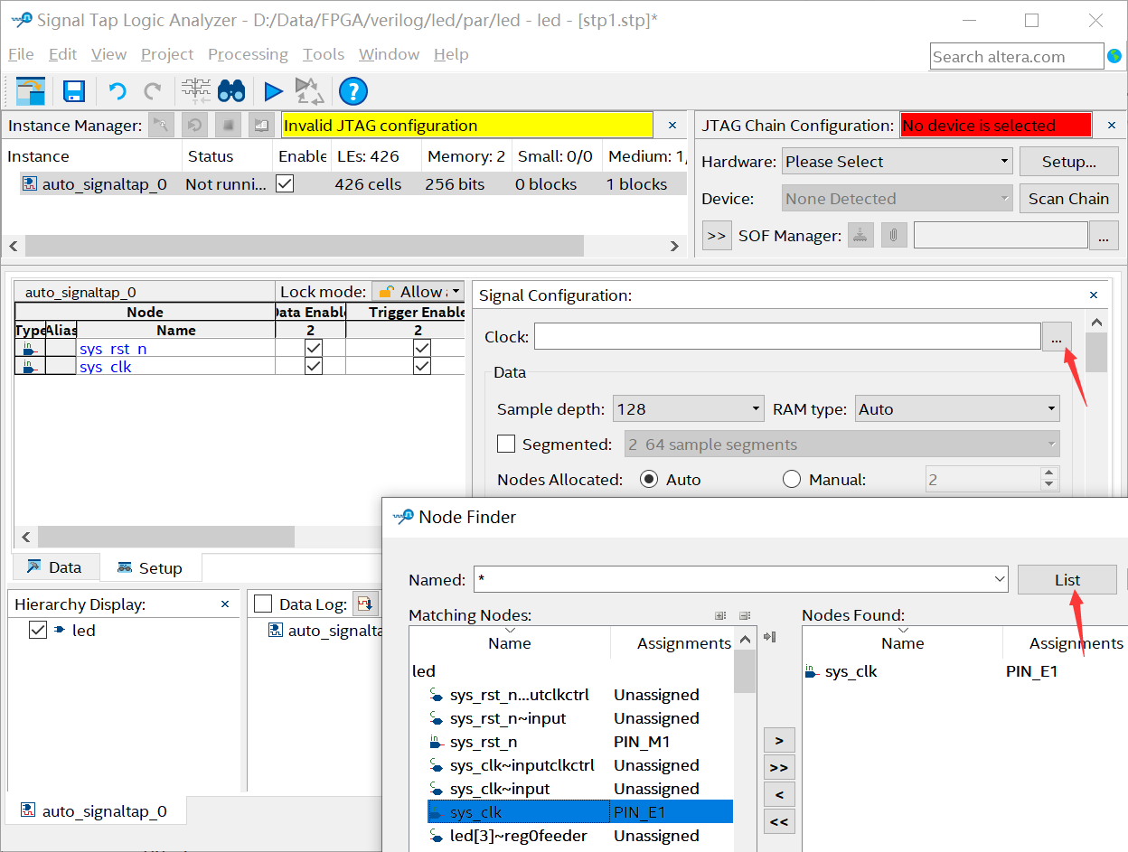如果发现添加的信号变成了红色,或者有些reg与wire定义的信号可以观察,有些不可以, 这是因为reg与wire被Quartus软件优化掉了,导致无法使用SignalTap观察。