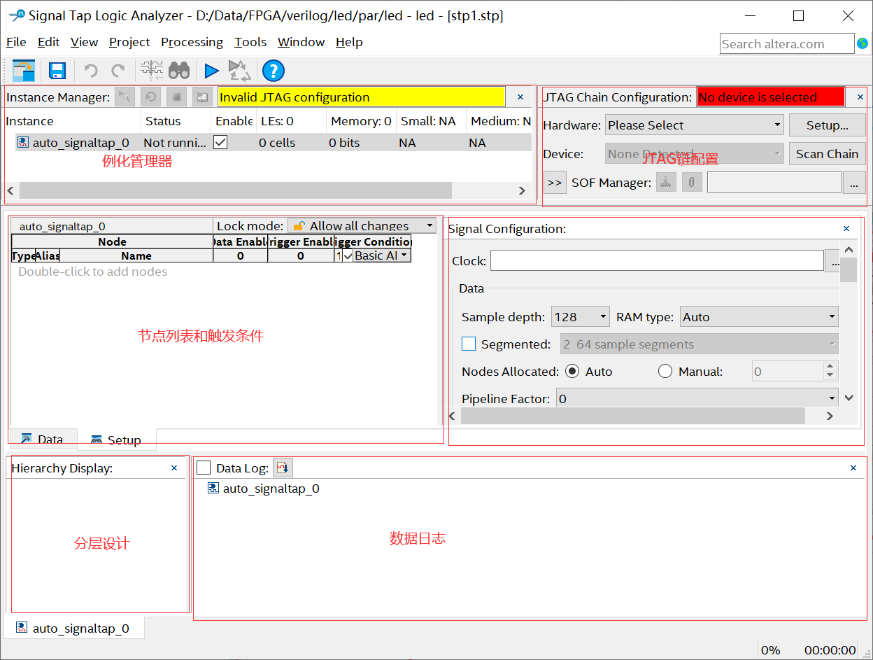 从SignaTap II软件界面中我们可以看出,它主要有例化管理器、 JTAG链配置、 信号配置、数据日志、分层显示、节点列表和触发条件组成。