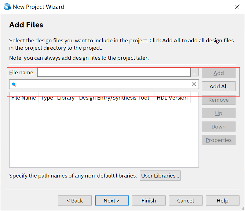 可以通过点击【 …】 符号按钮添加已有的工程设计文件( Verilog或 VHDL文件),由于这里是一个完全新建的工程,没有任何预先可用的设计文件,所以不用添加,直接单击【 Next】按钮