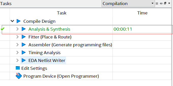 在编译过程中如果没有出现语法错误,编译流程窗口【 Analysis & Synthesis】 前面会变成对勾,表示编译通过。