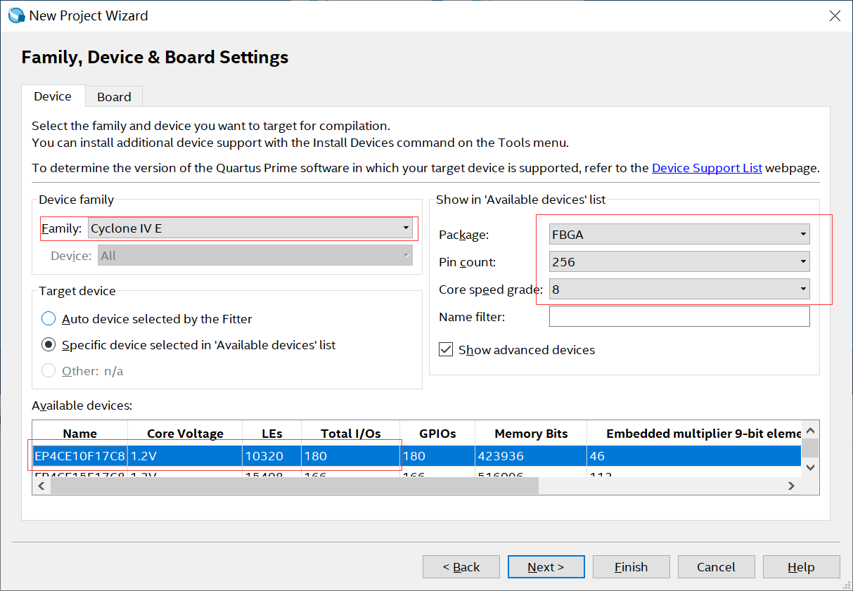 根据实际所用的FPGA型号来选择目标器件,我使用的是开拓者FPGA开发板主芯片是Cyclone IV E系列的“ EP4CE10F17C8”,所以在Device Family一栏中选择“ Cyclone IV E” 。Cyclone IV E系列的产品型号较多,为了方便在Available device一栏中快速找到开发板的芯片型号,在Package一栏中选择FBGA封装, Pin Count选择256引脚, Speed grade速度等级一栏中选择8, 之后在可选择的器件中只能看见符合要求的芯片型号了。