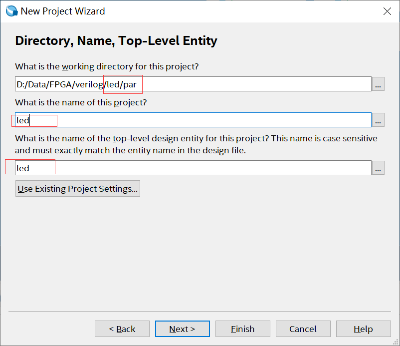 第一栏用于指定工程所在的路径;第二栏用于指定工程名,建议直接使用顶层文件的实体名作为工程名;第三栏用于指定顶层文件的实体名。这里设置的工程路径为D:/Data/FPGA/verilog/led/par文件夹,工程名与顶层文件的实体名同为led。文件名和路径设置完毕后,单击【 Next】按钮,进入下一个页面